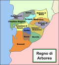 Politički zemljovid Sardinije 1368. - 1388. i 1395. - 1409. Plavo - Judikat Arboreja Narančasto - Kraljevina Sardinija