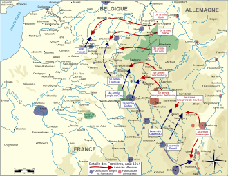 Izvorni njemački plan bio je napasti Belgiju i onda doći do Francuske sa sjevera, no odgođen je zbog prodora vojske generala Charlesa Lanrezaca, koji je uz britansku pomoć čekao Nijemce na sjeveru. Ipak, zajedničke britansko-francuske snage nisu uspjele zaustaviti Nijemce, koji su prodrli u sjevernu Francusku. Britanci i Francuzi naknadno su započeli seriju manjih napada s ciljem regrupiranja u Parizu. Njemački prodor je konstantno sabotiran, što je saveznicima omogućilo da povuku svoje trupe u Pariz i uspješno odbiju Nijemce na Marni.