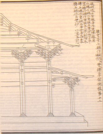 Od dinastije Han kineski graditelji su se usredotočili na izradu krova i njegovih potpornja iznad arhitrava profinjenih stupova. Najimpresivnije odlike krova su nepostojanje trokutastih veznih okvira, zbog čega su stupovi nosili umožena uporišta za grede ispod rogova. Isprva se to rješavalo uskom strehom i rasponom konzola, a kasnije je povećan broj stupova s konzolama, ali je smanjen razmak između vanjskih stupova. To je riješeno povećanjem površine nošenja ubacivanjem konzola na više razina, pa krakovi donjih konzola nose druge konzole poput prevrnute piramide uzduž i poprijeko. Od 3. stoljeća pr. Kr. krovovi se pokrivaju keramičkim crijepom polukružnog oblika, a crijepovi strehe su završavali rondelima koji su bili ukrašeni na različite načine. Vrlo kićene zgrade su imale pojedinačne konzole koje su izlazile iz glavnica stupova i zabatnog sljemena i završavale finom profilacijom.