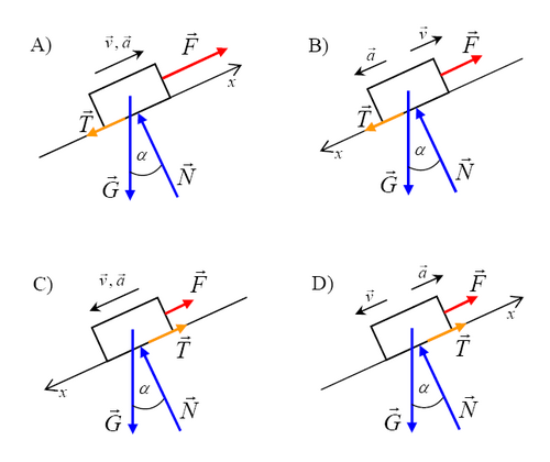 Zadatak počinje skicom tijela na kosini i sila koje ga vuku ili guraju u različitim smjerovima. Ovdje je radi jednostavnosti zadana samo jedna takva sila, označena kao Obrada nije uspjela. (Conversion error. Server ("https://wikimedia.org/api/rest_") reported: "Cannot get mml. Server problem."): {\displaystyle \scriptstyle {\vec {F}}} i prikazana u crvenoj boji, koja zatvara kut s kosinom. Usto, zadan je i smjer brzine i ubrzanja tijela.