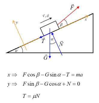 koji opisuje kolikim se silama tijelo i podloga međusobno stišću, i pomoću kojega se računa iznos sile trenja klizanja. (Jedan od obrazovnih ciljeva je da se pokaže kako trenje ne ovisi samo o normalnoj komponenti težine, nego i o normalnim komponentama drugih sila.) Potom se dobiveni iznos trenja Obrada nije uspjela. (Conversion error. Server ("https://wikimedia.org/api/rest_") reported: "Cannot get mml. Server problem."): {\displaystyle \scriptstyle T=\mu N=\mu (G\cos \alpha -F\sin \beta )} uvrsti u jednadžbu za Obrada nije uspjela. (Conversion error. Server ("https://wikimedia.org/api/rest_") reported: "Cannot get mml. Server problem."): {\displaystyle \scriptstyle x} komponente, iz koje se dobiva: