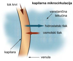 Krv sadrži hranljive tvari i važne metabolite. Gonjena radom srca krv se putem krvnih žila prenosi do tkiva koje snabdijeva navedenim tvarima. Na izlasku iz tkiva krv odvozi "otpadne" tvari. Ova razmjena ne vrši se izravno već putem vanstanične tekućine. Vanstanična tekućina se nalazi oko stanica i ispunjava prostor između njih. Pošto krv i stanice bez prestanka ispuštaju i uzimaju razne tvari u i iz vanstanične tekućine, jasno je da se sastav iste stalno mijenja. Voda i otopljene tvari slobodno se razmjenjuju između krvi i vanstanične tekućine i nalaze se u međusobnoj dinamičkoj ravnoteži. Sama razmjena odvija se kroz stjenke najmanjih krvnih žila, kapilara[2] .