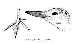 Izgled glave i stopala dromaha. Kljun je velik i težak, a nožni prsti su povezani plivaćom kožicom.