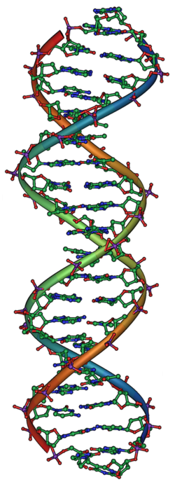 James D. Watson i Francis Crick su 1953. godine odredili strukturu DNK, koristeći radove na rentgenskoj strukturnoj analizi Rosalind Franklin i Mauricea Wilkinsa koji su pokazivali da je DNK imala spiralnu strukturu (oblika vadičepa).[18][19] Njihov dvospiralni model imao je dvije "vrpce" DNK s nukleotidima okrenutim prema unutra, i svaki se poklapao s dopunskim nukleotidom na drugoj vrpci formirajući "prečke" na uvrnutim "stepenicama".[20] Ta struktura pokazala je da genetska informacija postoji u sekvenci nukleotida na svakoj vrpci DNK. Također je i ukazala na jednostavnu metodu dupliciranja: ako se vrpce podijele, nova partnerska vrpca se može rekonstruirati za svaku na osnovu sekvence stare vrpce.