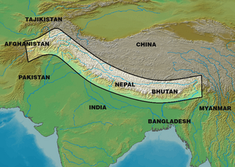 Himalaji se pružaju kroz pet država: Pakistan, Indija (i Sikkima koji se tek 1975. priključio Indiji), Kina, Butan i Nepal. Tri velike svjetske rijeke, Ind, Ganges i Brahmaputra, izviru na Himalajima. Otprilike 600-750 milijuna ljudi živi u području slijeva ovih rijeka, a taj broj uključuje i Bangladeš.