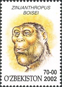 Poštanska marka Uzbekistana s prikazom Paranthropusa boisei, 2002.