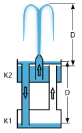 Dok voda curi iz posude A u posudu C, spušta se razina vode u posudi B. Cijev P2 potiskuje zrak kroz cijev u posudu B, zato što tlak pC postaje veći od atmosferskog tlaka p0. Tlak u posudi B, pB je jednak tlaku pC, što znači da je pB > p0. To izaziva vodu da ide uz cijev stvarajući vodoskok. [1]