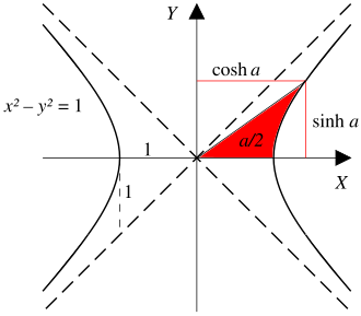 Geometrijski prikaz hiperbolnih funkcija. Desna polovica jedinične hiperbole , apscisa i pravac kroz ishodište i točku (ch a , sh a ) zatvaraju površinu ploštine a /2.