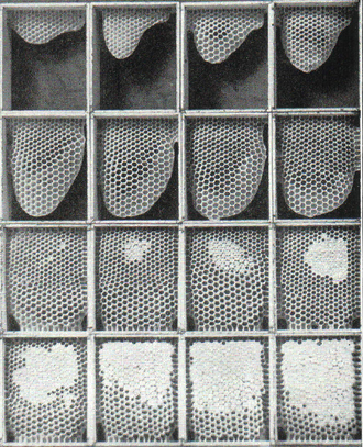 Pčele započinju gradnju saća tako da prvo zalijepe za tavan košnice red voštanih listića u okomitom položaju koje se još naziva i prihvatno saće. Ova saća su poluprizmatičnog oblika i na njih pčele dalje nadograđuju cijela saća. Saće se gradi tako da je jedan kut prizme okrenut prema gore, a drugi kut prema dolje, dok su paralelne stijenke u okomitom položaju. Time redovi stanica idu u vodoravnom ili horizontalnom slijedu. Dodavanjem satne osnove mijenja se način gradnje. Pčele tada grade na način da su paralelne stjenke u vodoravnom položaju, a slijed stanica se nastavlja u dijagonalnom položaju. [1]