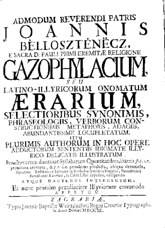 • 1740. Gazophylacium, seu Latino-Illyricorum onomatum aerarium. Zagrabiae: Typis Joannis Baptistae Weitz.[11]