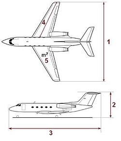 Osnovne dimenzije zrakoplova koje se navode prilikom njegovog opisa su njegova dužina, visina, raspon krila i površina krila. Dužina (3) se mjeri od nosa zrakoplova do najisturenijeg dijela repnih površina. Visina (2) se mjeri od tla do najvišeg dijela zrakoplova, ovisno o izvedbi to može biti okomiti ili vodoravni stabilizator. Raspon (1) (razmah krila) (Eng.Wing span) je dužina koja spaja vrhove lijevog i desnog krila. Kod aviona s promjenjivom geometrijom krila raspon nije stalna veličina. Površina krila () podrazumijeva ukupnu površinu lijevog i desnog krila, a za pojedino krilo je jednaka umnošku razmaha (udaljenosti vrha krila od trupa) krila s prosječnom širinom krila.