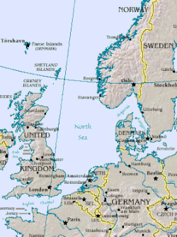 - Ujedinjeno Kraljevstvo (otok Velika Britanija i otoci Shetland i Orcades) na zapadu ;