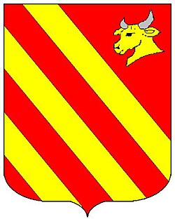 (HR) Na crvenom polju tri lijevo kose zlatne grede u desnom kutu zlatni profil glave bika. [1/33] | |