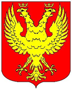 (HR) Podjela na četvrtine sa središnjim grbom. 1 četvrtina: tri para lijevo kosih greda crveno srebrene, 2 četvrtina: okomita podjela, lijevo: na crvenom polju srebreni križ preko svega, desno na crvenom tri lijevo kose srebrene grede, 3 četvrtina na plavom zlatni lav, 4 četvrtina na crvenom srebrena kula stoji na srebrenom brijegu. Središnji grb na crvenom polju zlatni lav, preko svega zlatna vodoravna greda, duž grede tri šestero krake zlatne zvijezde. [1/26, ] | |