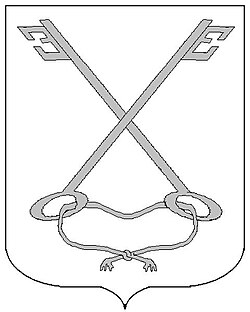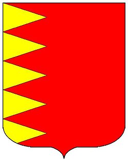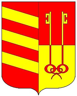 - (HR) Okomita podjela. Lijevo na crvenom polju tri lijevo kose zlatne grede, desno je vodoravna podjela; gore crveno polje, dolje zlatno polje, preko svega dva okomita ključa suprotnih boja od boja polja zlatno- crveni, ključevi su povezani uzicom. [1/24, 3]