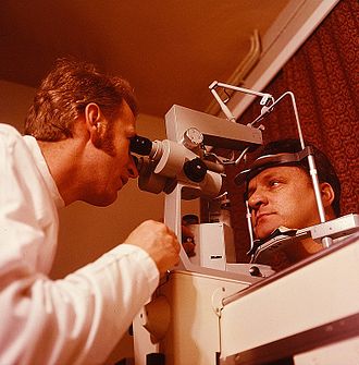 Za vrijeme pregleda ispitanik sjedi na stolici ispred biomikroskopa, a bradu i čelo prisloni u posebna ležišta kako bi mu glava za vrijeme pregleda bila fiksirana.