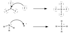 Time su objašnjeni slučajevi koje Bronstedt-Lowryjeva teorija nije mogla pojasniti. Reakcijom Lewisove kiseline s bazom nastaje adukt (produkt spajanja čestica) u kojem su dvije vrste povezane kovalentnom vezom a zajednički elektronski par daje baza. Lewisova kiselina ne mora sadržavati proton. Ako su Lewisova kiselina i baza nenabijeni, dobivena veza je dijelom polarna kao u reakciji bor trifluorida s amonijakom: