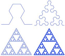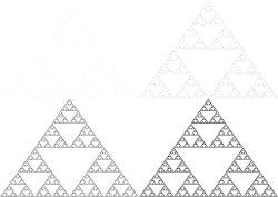 Drugi način konstrukcije trokuta Sierpińskog jest da se početni trokut skalira s faktorom 1/2 te se naprave dvije kopije koje se smjeste tako da jednim vrhom dodiruju drugu kopiju, a drugim početni (skalirani) trokut. Rezultat je, naravno, isti, ali se ova metoda može koristiti za razne druge oblike, kao na slici: