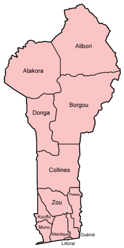 Benin je podijeljena na 12 departmana (fra.: départements), koji su dalje podijeljeni u ukupno 77 općina (fra.: communes). Godine 1999., prijašnjih šest departmana podijeljeni su svaki na dva, tako da ukupno danas postoje 12. Glavni gradovi pojedinih departmana još nisu određeni: