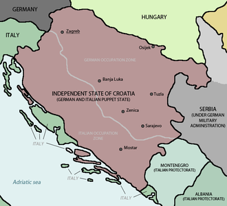Nacistička Njemačka i fašistička Italija su tretirale Nezavisnu Državu Hrvatsku, kao svoju satelitsku državu, pa su je podijelili na dvije interesne zone. Italija je u svoju zonu uzela 100–120 km teritorija od obale Jadranskog mora u dubinu, a ostalo otuda do Drine, Drave i Dunava je bilo u njemačkoj ovlasti. Demarkacijska crta te podjele išla je južno od Samobora do Jajca, Bugojna i Goražda na Drini. Dakle, Bosna i Hercegovina je bila podijeljena tako da je zapadni dio Bosne i čitava Hercegovina bio pod talijanskom, a ostala Bosna pod njemačkom indirektnom okupacijom.