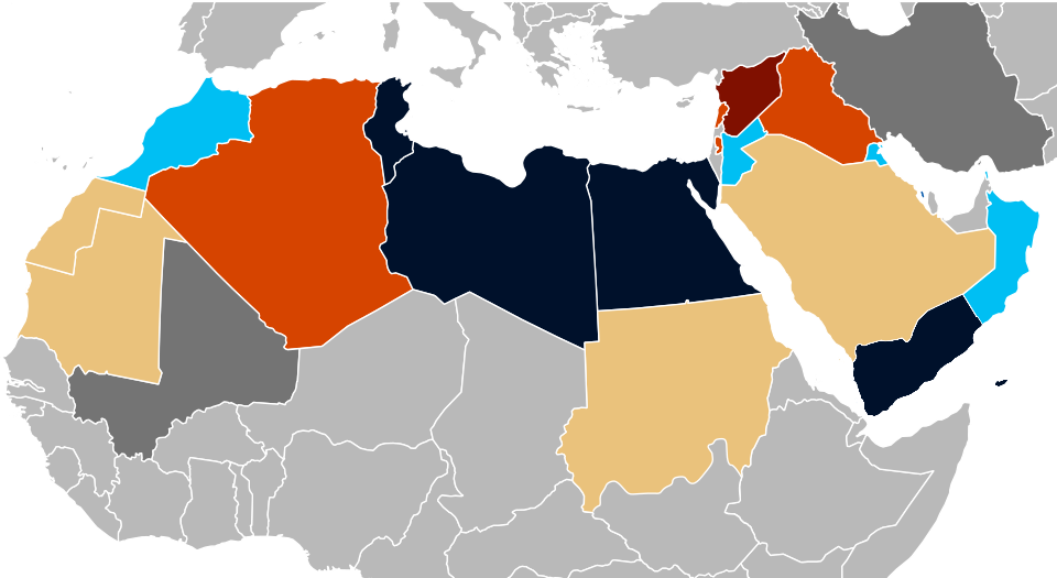 Prosvjedi i nemiri do danas su doveli do rata u Libiji, revolucije u Tunisu i egipatske revolucije. U Alžiru, Bahreinu, Džibutiju, Iraku, Jordanu, Omanu, Siriji i Jemenu nastali veliki prosvjedi. Manji incidenti su se dogodili u Kuvajtu, Libanonu, Mauritaniji, Maroku, Saudijskoj Arabiji, Sudanu i Zapadnoj Sahari.[3][4][5][6][7].