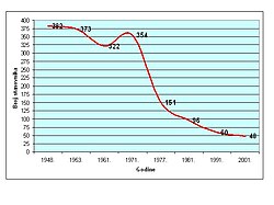 Pojava da uopće nema muške djece do 10 godina starosti, da nedostaje ženska populacija između 20 i 40 godina i da, brojčano slabije, hipertrofiraju dobne skupine iznad 65 godina, govore da je vitalitet stanovništva drastično smanjen, fertilitet praktično ne postoji, a mortalitet, uz iseljavanje postaje glavni i najutjecajniji činilac promjene stanovnika.