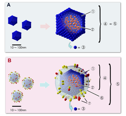 Neki su virusi obavijeni lipidskom ovojnicom (6) koja potječe od stanice u kojoj se umnožavaju. Iz nje strše glikoproteinski izdanci (7) kojima se virus prihvaća na stanicu primatelja. Takvi su npr. virusi gripe, bjesnoće i HIV. Slika prikazuje građu neovijenog (A) i ovijenog (B) virusa.