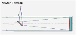 Reflektorski teleskop, čiji je jedan od prvih primjeraka konstruirao 1671. Isaac Newton, zasnivaju se na principu da svjetlost pada u dno tubusa teleskopa, na kojemu se nalazi parabolično ogledalo (primarno zrcalo) i otuda se odbija prema gore, na malo ravno ogledalo (sekundarno zrcalo), koje se nalazi okrenuto pod kutom od 45°. Odatle se šalje bočno, u okular koji povećava sliku. Prednost ovakvog teleskopa je u tome da daje praktično neobojanu sliku, zahvaljujući tome, što ogledalo odbija zrake svih boja na isti način. Samo okular, koji sadrži leće, može unijeti malo boje, ali ako je kvalitetan, to se u praksi i ne primijeti. Suvremena ogledala su napravljena od kvarca, prekrivena izvanredno tankim slojem aluminija ili srebra. Postoje i drugi tipovi teleskopa, pored Newtonovog. U tipovima Gregorijevom i Cassegrainovom, drugo je ogledalo ispupčeno i odbija svjetlost u smjeru jednog otvora, probušenog u sredini glavnog ogledala. U Hershellovom teleskopu, koji je praktično danas napušten, primarno je ogledalo nagnuto, pa nema potrebe za drugim ogledalom. [2]