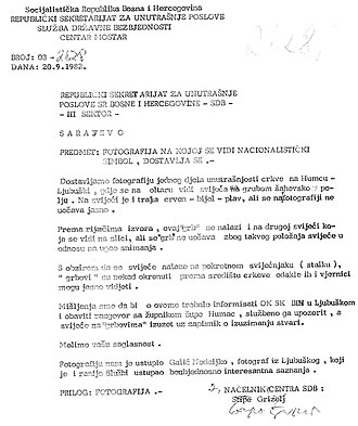 Prijava o "nacionalističkim simbolikama" u crkvi u Humcu kod Ljubuškog. Priča je o svijeći s hrvatskim grbom. (1982.)