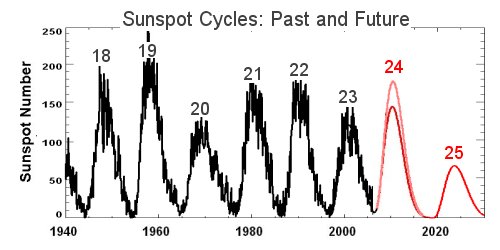 Od 2007. do 2009. primijećeno je da je broj Sunčevih pjega puno manji od prosjeka.[14] U prosincu 2009. pojavila se veća skupina Sunčevih pjega, ali to je još uvijek ispod prosjeka.[15]