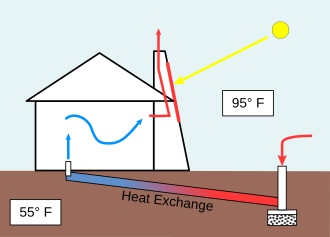 Ovaj vrlo jednostavan i jeftin način ventilacije u svojoj se najjednostavnijoj varijanti sastoji od dimnjaka obojanog u crno. Zašto u crno? Idealno crno tijelo je savršeni apsorber i upija svo elektromagnetsko zračenje koje padne na njega, što znači da će u realnom stanju tijelo obojano u crno upiti najviše Sunčevog zračenja koje padne na njega u usporedbi sa istim tim tijelom neke druge boje. Tijekom dana Sunčevo zračenje grije dimnjak, a tako i zrak unutar njega, te se zbog toga javlja efekt dimnjaka pri čemu dolazi do strujanja toplog zraka prema gore. Kako se topli zrak diže prema gore, u podnožju dimnjaka javlja se slabi podtlak zbog čega se javlja strujanje zraka iz građevine prema dimnjaku. Tada se u građevini javlja podtlak zbog kojeg se onda javlja strujanje zraka u građevinu. U varijanti koja je prikazana na slici vanjski okolišni zrak ulazi u podzemni izmjenjivač topline koji je ujedno i spremnik svježeg zraka, te se tu hladi predajući toplinu tlu. Može se smatrati da tlo na određenoj dubini uvijek ima istu temperaturu (od +8 do +12ºC) što omogućuje upravo ovakav način pasivnog hlađenja. Takav ohlađeni zrak onda zbog spomenutog podtlaka u građevini struji iz rashladnog spremnika u građevinu. [2]