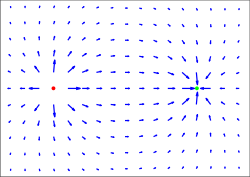 Stavimo li naboj e jednak 1, tad je iznos sile jednak polju E. Električno polje, prema tome, jednako je sili na jedinicu pozitivnog električnog naboja. U našem kondenzatoru, koji stoji vodoravno, električno polje ima smjer prema gore ili prema dolje, već prema tome da li gornja ploča kondenzatora ima negativan ili pozitivan naboj. Smjer električnog polja daje sila na pozitivan naboj. Kao pozitivan naboj uzet je naboj natrljanog staklenog štapa, kojim smo na primjer mogli nabiti gornju ploču kondenzatora.