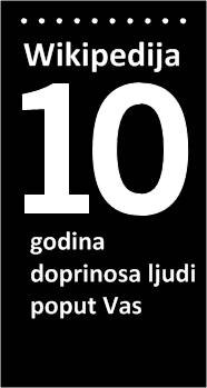 U subotu 22. siječnja 2011., između 14 i 18 sati (točnije vrijeme biti će objavljeno naknadno), u Zagrebu na lokaciji koja će biti prilagođena broju onih koji najave dolazak održat će se obilježavanje desete godišnjice Wikipedije u organizaciji udruge Wikimedija Hrvatske. Wikipedija:Susreti Wikipedista/Potvrda4|Potvrdu dolaska molim ovdje]].