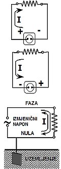 Ako izvor struje mijenja polaritet, pa svaki pol izvora postaje naizmjenično pozitivan, a iza toga negativan i tako u nedogled, kroz strujni krug će se odgovarajuće mijenjati i smjer struje.