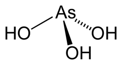 Dodavanjem baze arsenitna kiselina prelazi u arsenitne ione, [AsO(OH)2]-, [AsO2(OH)]-2 i [AsO3]-3.
