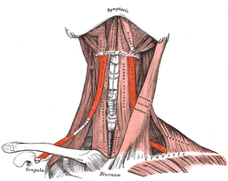 Mišić polazi sa donjeg ruba jezične kosti prema dolje do intermedijarne tetive. Drugi trbuh počinje intermedijarnom tetivom, okomito na smjer prvog trbuha i hvata se na gornji rub lopatice.