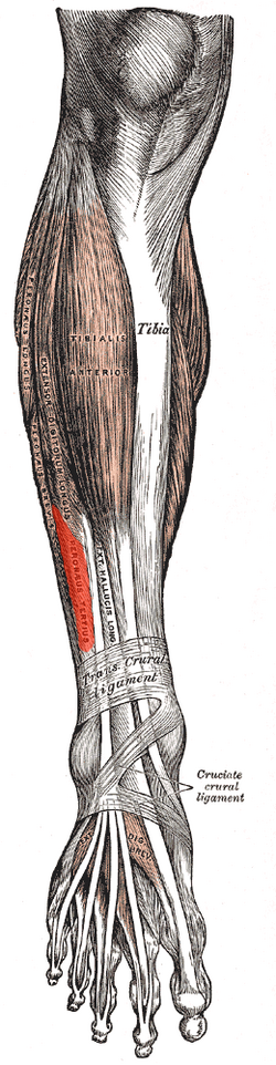 Mišić polazi s lisne kosti (medijalne strane) i hvata se za gornju stranu pete kosti donožja.