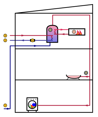 2: Sabirni ili izlazni cjevovod iz dodatnog (pasivnog) izvora topline; na primjer od toplinske pumpe ili toplovodnog Sunčevog kolektora,