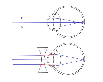 Naočale su optičke leće koje se postavljaju pred oči da bi se kod slabih očiju postigla potrebna oštrina vida. Kod kratkovidnih očiju slika predmeta koji se nalazi na daljini od 250 milimetara, pada ispred mrežnice. Da bi slika pala na mrežnicu, kratkovidni ljudi primaknu predmet koji gledaju bliže oku, jer što je predmet bliže oku, slika je dalje. Da bi se ta pogreška ispravila, kratkovidni ljudi nose naočari s rastresnim ili konkavnim (udubljenim) lećama. Kod dalekovidnih očiju je obratno, to jest slika predmeta pada iza mrežnice. Ljudi takvih očiju odmaknu pri čitanju knjigu daleko od očiju. Za ispravku takve pogreške služe sabirne ili konveksne (ispupćene) leće.[2]