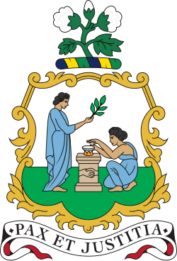 Na vrhu grba je stabljika pamuka, a ispod nje su dvije žene u rimskim togama. Lijeva žena, koja drži maslinovu grančicu, simbolizira mir, a desna, koja kleči pred oltarom na kojem je vaga, simbol je pravde.