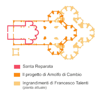 Gradnju katedrale započeo je Arnolfo di Cambio 1296. godine. Financirana od firentinske republike, trebala je biti veličanstveni izraz srednjovjekovne vjere, ali i ponosa građanske uprave u Italiji. Lijepa školjka, od bijelog i zelenog mramora, nad gotičkim apsidalnim tlocrtom trebala je formirati mirnu i prostranu unutrašnjost. Talijani, poput Nijemaca, su nevoljko napuštali romanički stil i prihvaćali gotiku te su se, ubrzo nakon 1400. godine, okrenuli novom renesansnom stilu. Gotički stil je općenito bio ublažen i modificiran klasičnim proporcijama i mediteranskim poštivanjem ljudskog mjerila – za širinu više nego za visinu. Talijani su u svojim crkvama tražili obilje slobodne podne površine kako bi odgovaralo masovno posjećenim propovijedima.