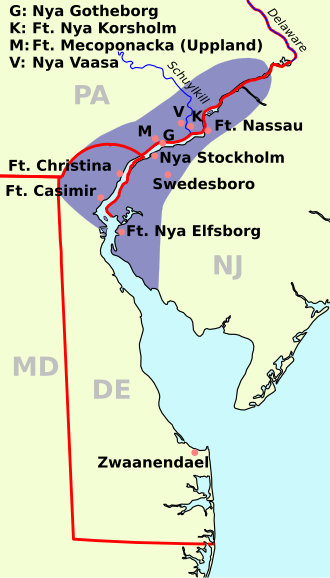 Prva švedska kolonija je bila Nova Švedska, koju je 1638. godine, osnovala Nova švedska kompanija na obali Atlantika u Sjevernoj Americi, na istijeku rijeke Delaware. Ova kolonija se nalazila oko Fort Kristine (danas u gradu Wilmingtonu u državi Delaware), koja je nazvana po kraljici Kristini od Švedske. Veliki broj kolonijalista su bili Finci, jer je Finska do 1809. godine, bila istočna trećina Švedske. Švedska je dosegnula najveću veličinu svog teritorija u 17. stoljeću, te je zauzimala i neka njemačka i baltička područja. Nizozemci su također bili prisutni na ovom području sa kolonijom Nova Nizozemska. Šveđani su, sjeverno od današnjeg Salema u New Jerseyu, 1843. godine, osnovali i tvrđavu Fort Nya Elfsborg. U svibnju 1654. godine, su zauzeli nizozemsku tvrđavu Casimir. Kao odgovor, nizozemski guverner Peter Stuyvesant je poslao vojsku na rijeku Delaware, koja je nakom rata izvojevala pobjedu od Šveđana, koji su napustili tvrđave koje su onda uključene u Novu Nizozemsku.