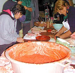 Žene rade sobrassadu (Son Ferriol, Mallorca). Sobrassadu sa Mallorce. Zamjena za rakove Surimi.