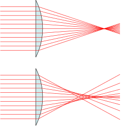 Sva svojstva optičkih leća, to jest sakupljanje zraka u jednoj točki, konstrukcija slike i tako dalje (geometrijska optika), vrijede samo za tanke leće i za zrake koje padaju na leću u blizini osi leće. Kod debljih leća i za zrake koje padaju na rub leće, to jest dalje od osi, nastaju pogreške kod stvaranja slike koje se očituju u tome da je slika bez oštrine. [2]