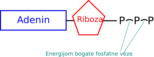 Shematski prikaz dijelova molekule adenozin-trifosfata i fosfatnih veza