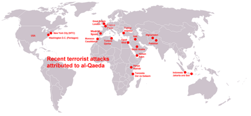 Vođa al-Kaide, Osama bin Laden je ponudio saudijskom rukovodstvu zaštitu od strane svojih boraca, kako nevjerničke (nemuslimanske) trupe ne bi kročile u zemlju u kojoj se nalazi najsvetiji islamski grad, Meka. Međutim, saudijsko rukovodstvo nije prihvatilo ovu ponudu, već se okrenulo svojim zapadnim saveznicima. Vođe al-Kaide tvrde da SAD i Velika Britanija ugnjetavaju muslimane. Al-Kaida koristi američku invaziju i okupaciju Iraka, prisustvo američkih trupa u nekoliko islamskih zemalja, i američku podršku Izraelu, za regrutiranje mladih muslimana.