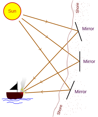 Čitava je priča, dakle, započela u 3. st. pr. Kr., kada je Arhimed razvio ideju paraboličnog zrcala za paljenje kako bi stvorio prvo oružje u povijesti svijeta utemeljeno na tom načelu. Svi koji su provodili pokuse sa snažnim zrcalima i lećama za paljenje, kako bi fokusirali fantastično moćne zrake i uništavali predmete s velikih udaljenosti, samo su ponavljali Arhimedovo djelo. Ta zamisao, koju kolokvijalno nazivamo idejom o "smrtonosnoj zraci", živa je već stoljećima. Vatra se može zapaliti pomoću refleksije, refrakcije, te jednostavnog i složenog stakla ... Paraboličkim presjekom moguće je još učinkovitije s veće udaljenosti i u kraćem vremenu zapaliti predmete koji se nalaze ispred zrcala za paljenje: rastopit će se čak i olovo i lim, srebro i zlato. Zahvaljujući tom izumu, Arhimed je izvješću, zapalio rimsko brodovlje u doba kada je Marcelin opsjedao Sirakuzu. U svome djelu Život Pompilijev Plutarh kaže da je vatra koja je gorjela u Dijaninu hramu (zapravo, hramu božice Veste) zapaljena pomoću toga stakla ("staklo" ovdje valja protumačiti kao "zrcalo"). Postavi li se, dakle, nasuprot Suncu, ono će ubrzo zapaliti sve zapaljive predmete, a ako je istina da je Arhimed pomoću paraboličkog stakla postavljenog na gradske zidine spalio brodovlje, udaljenost (koja odgovara dosegu odapete strijele) nije mogla biti veća od deset koraka.