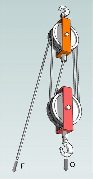 Arhimedov ili obični koloturnik se sastoji od nekoliko pomičnih i nekoliko nepomičnih kolotura koje su smještene u dva kućišta. Gornje kućište je učvršćeno, a donje je pomično. Preko kolotura prolazi uže, pa na jednom kraju djeluje sila F, dok je drugi kraj pričvršćen na gornje nepomično kućište. Donje se kućište giba zajedno s teretom. Ako je n broj svih kolotura, broj nosećih užeta je isto n. Budući da svako uže nosi dio tereta G/n, to je za dizanje tereta potrebna sila ne uzevši u obzir trenje: [4]