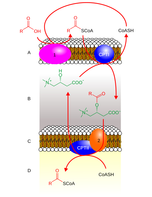 crveno: acil-CoA, zeleno: karnitin, crveno+zeleno: acil karnitin, CoASH: koenzim A, CPTI: karnitin aciltransferaza I, CPTII: karnitin aciltransferaza II, 1: acil-CoA sintetaza, 2: translokaza, A: vanjska mitohondrijska membrana, B: međumembranski prostor, C: unutarnja mitohondrijska membrana, D: mitohondrijski matriks
