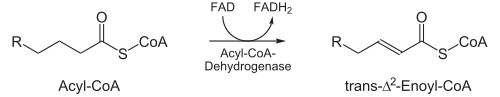 | Dehidrogenacija FAD-om: Prvi je korak oksidacija masne kiseline od strane enzima acil-CoA dehidrogenaze, koji katalizira formiranje dvostruke veze između C2 i C3. | acil CoA dehidrogenaza | trans-Δ2-enoil-CoA | |